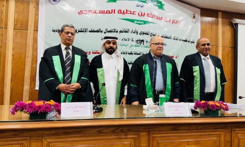 «تأثيرات تطبيقات الذكاء الاصطناعي في إنتاج المحتوى وأداء القائم بالاتصال بالصحف الإلكترونية السعودية»، ومنحته لجنة المناقشة والحكم الدرجة مع مرتبة الشرف الأولى.