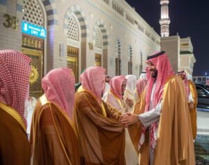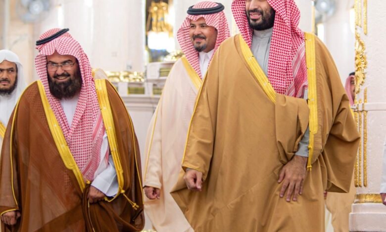 السديس وأئمة وخطباء المسجد النبوي في استقبال ولي العهد لدى زيارته المسجد النبوي الشريف