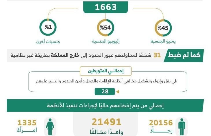 ثانيًا: بلغ إجمالي من تم ضبطهم خلال محاولتهم عبور الحدود إلى داخل المملكة (1663) شخصًا (45%) منهم يمنيو الجنسية، و(54%) إثيوبيو الجنسية، وجنسيات آخرى (01%)، كما تم ضبط (31) شخصًا لمحاولتهم عبور الحدود إلى خارج المملكة بطريقة غير نظامية.