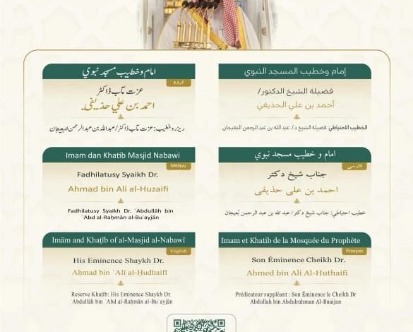 فيما يخطب ويؤم المصلين في المسجد النبوي فضيلة الشيخ الدكتور أحمد الحذيفي