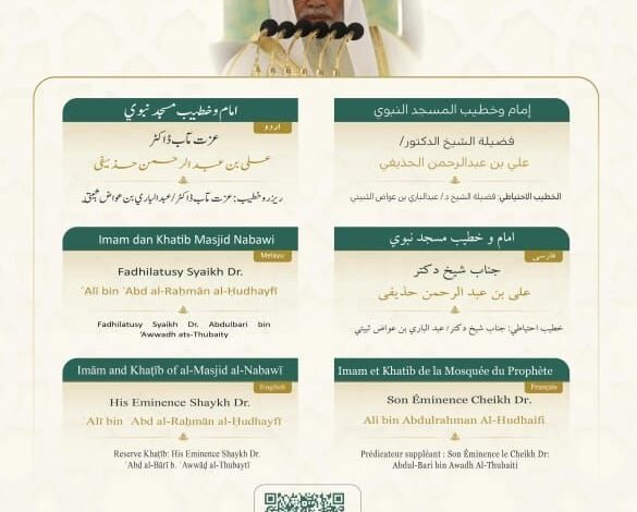 فيما يخطب ويؤم المصلين في المسجد النبوي فضيلة الشيخ الدكتور علي الحذيفي