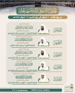 اعتمدت رئاسة الشؤون الدينية بالمسجد الحرام والمسجد النبوي الجدول الأسبوعي لأصحاب الفضيلة أئمة الحرمين الشريفين، للفترة من اليوم الأحد 10 إلى يوم السبت القادم 16 شوال 1447هـ وذلك ضمن جهودها لتنظيم الصلوات وتيسير متابعتها لعموم المصلين والزوار.