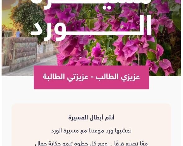 دعت الإدارة العامة للتعليم في الطائف الطلاب والطالبات والمجتمع التعليمي للمشاركة في مسيرة الورد ، وذلك يوم الخميس 14 شوال 1447هـ في منتزة الردف بوابة 1 وتأتي هذه المسيرة ضمن البرامج والفعاليات التي تشارك بها الإدارة في ملتقى الورد العالمي للورد والنباتات العطرية 2026 م