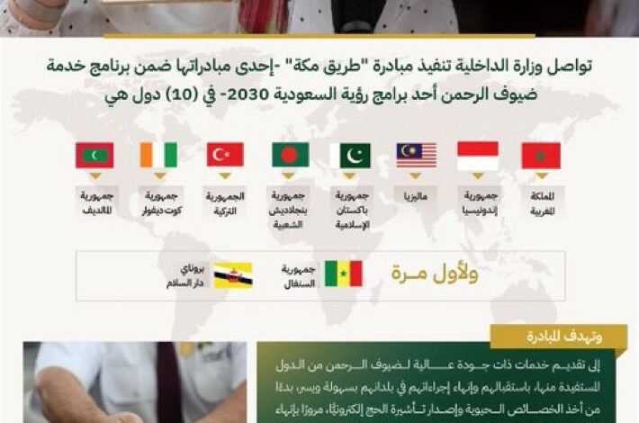 تواصل وزارة الداخلية تنفيذ مبادرة “طريق مكة” -إحدى مبادراتها ضمن برنامج خدمة ضيوف الرحمن أحد برامج رؤية السعودية 2030- عبر (17) منفذًا في (10) دول هي المملكة المغربية، وجمهورية إندونيسيا، وماليزيا، وجمهورية باكستان الإسلامية، وجمهورية بنجلاديش الشعبية، والجمهورية التركية، وجمهورية كوت ديفوار، وجمهورية المالديف، ولأول مرة جمهورية السنغال وبروناي دار السلام.